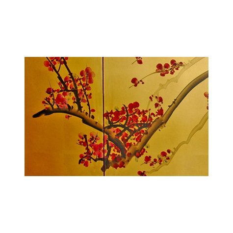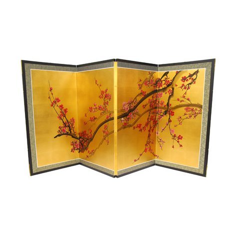 The brilliant red blossoms of the plum tree have been a richly symbolic subject of Chinese art and poetry for over a thousand years. Master artisans working in this tradition have painted and gilded these screens by hand, and no two are exactly alike. Each comes mounted on four panels, bordered with silk brocade, and set in a lacquered wooden frame. Ornamental hangers are included for wall mounting, but this painting can also be folded and placed on a table or floor to create an artful privacy screen.Feature