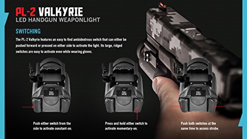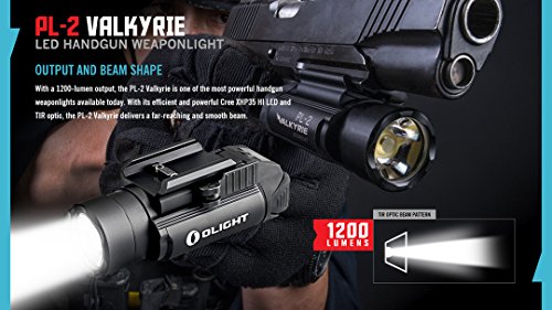 - BRIGHTEST PISTOL LIGHT - At 1200 lumens max output, the PL-2 Valkyrie is the brightest weapon light of its size available. A high power CREE XHP35 HI LED and a TIP optic lens offer a focused 257 yard beam. It is designed for pistols such as Glock, S&W, Sig Sauer, Springfield, Beretta, Ruger, Heckler & Koch, FN, Taurus