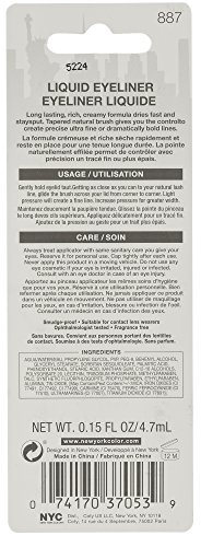 New York Color Liquid Eyeliner, Black 887 Long lasting, rich, creamy formula dries fast and stays put. Tapered natural brush gives you the control to create precise ultra fine or dramatically bold lines.