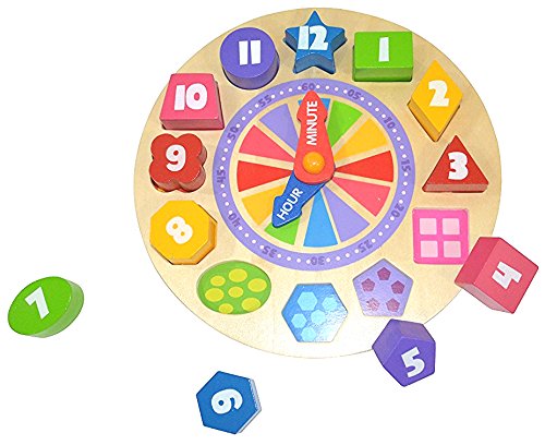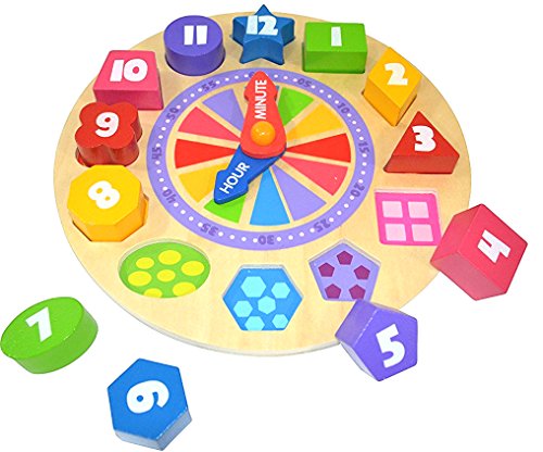 Wooden clock with 12 removable pieces for teaching time-telling and more. Fun Glow in the Dark feature -the number digits glow in the dark as shown in the picture. The hour and minute hands rotate which not only encourages realistic practice, but also making play time fun! Non-toxic paint, and child friendly, sturdy wooden construction. This interactive toy clock helps kids to learn basic concepts of time telling, further enhancing them fine motor skills, teaching them numbers, colors and shapes.Feature