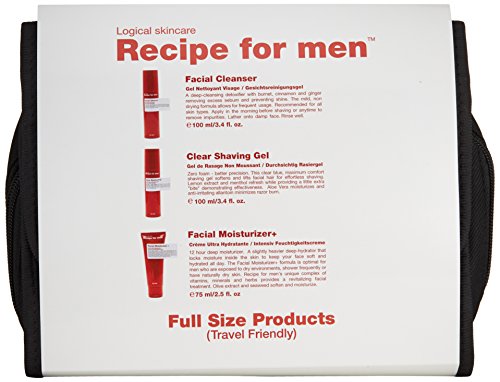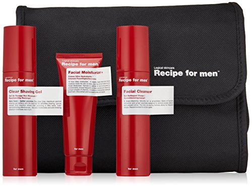 ReleaseDate : 2015-05-15 Studio : Recipe for Men Publisher : Recipe for Men Binding : Health and Beauty Product Description The perfect solution to test drive the Recipe for Men basic regimen, provided in a hanging dopp kit. The travel kit includes full-size tubes (all travel friendly) of facial cleanser (3.4 fl. oz.), clear shaving gel (3.4 fl. oz.), and our facial moisturizer (2.5 fl. oz.). The combination ensures balanced and hydrated skin that will have less blemishes and less irritation with effective moisturizing and anti-inflammatory ingredients. 0