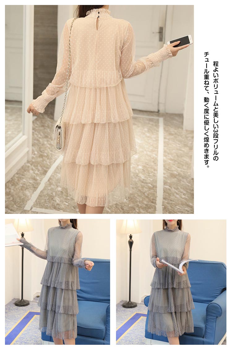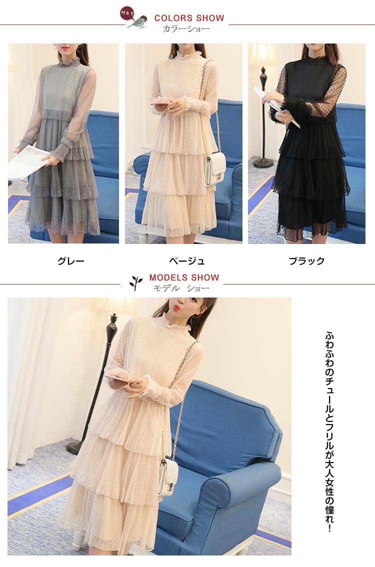 | ふわふわのチュールとフリルが大人女性の憧れ!フリル衿×袖透けチュールが大カワイイワンピが登場!程よいボリュームと美しい3段フリルのチュール重ねて、動く度に優しく煌めきます。着心地も良くさらっとした素材なので通気性も◎清潔感のある色合いでどんなアイテムとも合わせやすいのでヘビロテ確実の一着♪結婚式や発表会のフォーマルシーンにもおすすめな華やかなルックスのワンピース! | |