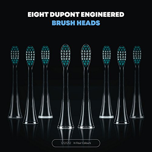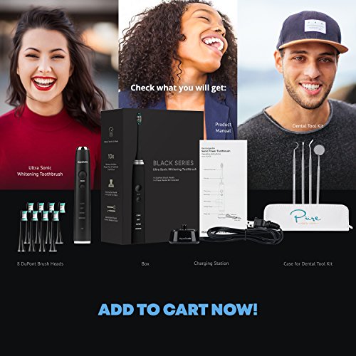 Ultra Sonic Whitening Toothbrush with industry leading ultra powerful 40,000 VPN Motor to whiten and polish teeth while providing a deep clean - 4 Distinct Cleaning Modes including "Clean" for standard brushing, "Soft" for sensitive teeth, "Whiten" which uses the full 40,000 VPM to dissolve surface stains and whiten teeth over time, while "Massage" uses pulsating vibrations to boost blood circulation around teeth and gums to improve complete oral health profile. A total of 8 Premium quality DuPont Engineered brush heads are included. Also included is a professional stainless steel dental kit to be used bi monthly to remove more stubborn stains and avoid expensive trips to the dentist.Feature