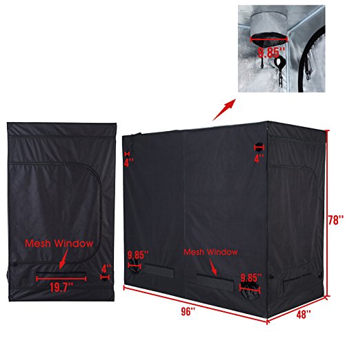 -. Brand : iPyarmid -. Color : Black -. EAN : 0713803618029 -. Feature : High reflective 600D Mylar / -Heavy-duty 10# zippers and zip head / Non-toxic material to keep your plant safety / Quick and easy to assemble, even for large sizes / 100% of no light to enter the canvas with 95% of the reflection -. Label : iPyarmid -. Manufacturer : iPyarmid -. PackageQuantity : 1 -. ProductGroup : Lawn & Patio -. ProductTypeName : OUTDOOR_LIVING -. Publisher : iPyarmid -. Size : 96"x48"x78" -. Studio : iPyarmid -. Title : iPyarmid 96"x48"x78" 600D Indoor Grow Tent Room Reflective Mylar Hydroponic Non Toxic Hut -. UPC : 713803618029