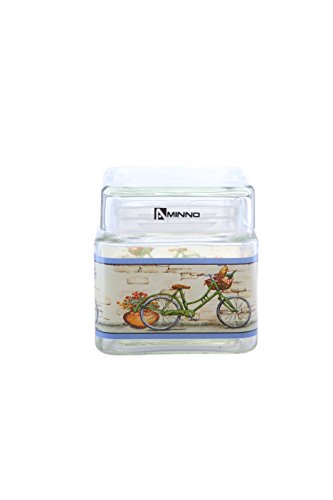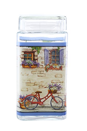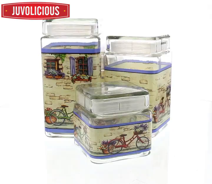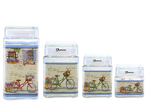 Square Glass Food Container Small Medium Large Classic French Village Themed Container Dry Food Candy Cereal Pasta with Suction Sealed Top - 4 Piece Set