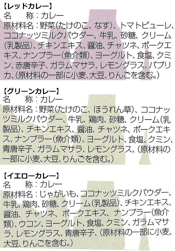 | セット内容 | レッドカレー160g×3 グリーンカレー160g×2 イエローカレー160g×2 |