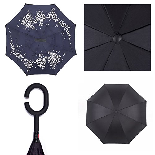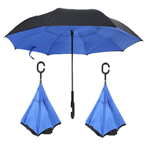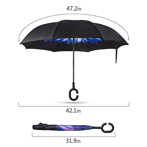-. Feature : 1.Unique Design: you can open this inverted umbrella as you open the door and not get wet, And when you close the reverse umbrella, getting back in the car, the water stays inside of the umbrella and doesn't get the car floor wet / 2.Textured C Shape Handle: It'll leave your hands free for holding a baby or using a mobile if needed , The convenient button design make the inside out umbrella easy to operate / 3.The Double Layer Inverted Umbrella Made of: pongee cloth, durable black electric ribs and double layer ribs make the cars umbrella more sturdy, enhance its windproof effect / 4.Ideal Gift: This Cars Reverse Umbrella Is a Necessary Tool for your car, Also It's a Creative Gift for a Creative Gift for Your Parents,Friends, Colleague,Lovers etc.Measures 31.5" long and 41.8" in diameter when open. It's large enough to shelter both you and your loved one from the downpour. / 5.Easy To Storage: It can stand up on its own, ideal for when you have nowhere to prop your umbrella up against. It will also keep the wet part of the umbrella inside once you've closed it, so things don't get dripped on when you put it away after coming indoors