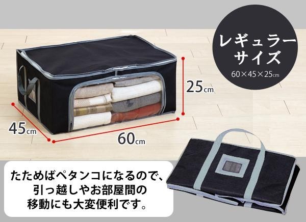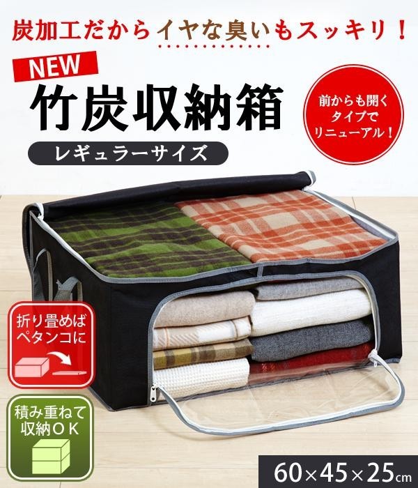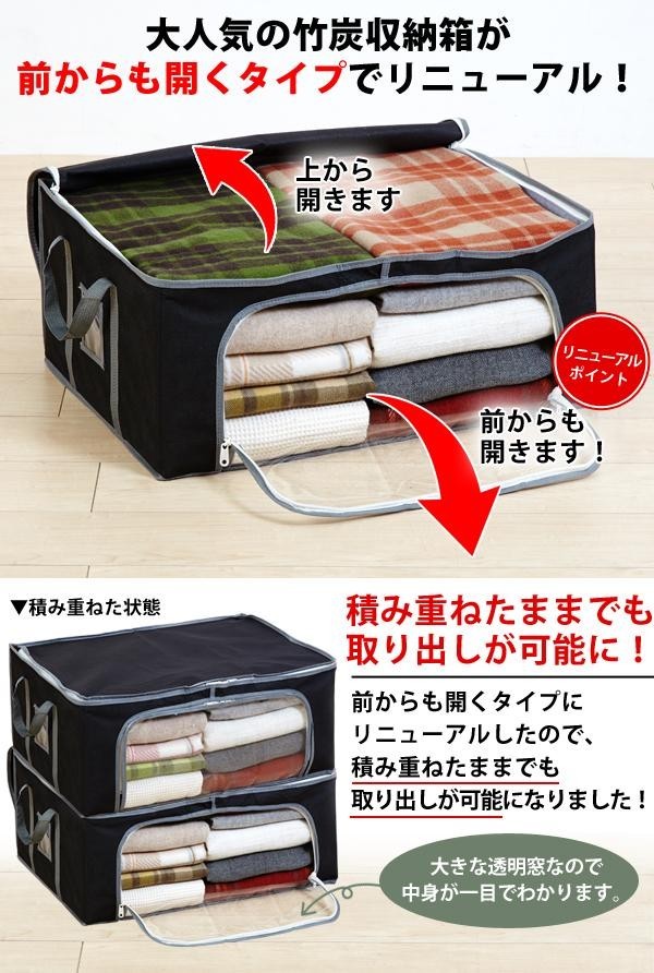 前からも開くタイプなので、積み重ねて収納できます。さらに前面は透明窓なので、中身が一目でわかります。 製造国:中国 素材・材質:表生地:不織布(ポリプロピレン)裏生地:炭加工の不織布ジップ:ナイロン、透明窓:PVC中芯:紙、持ち手:ポリプロピレン 商品サイズ:60×45×25cm ※サプライヤー直送品 ご注文後7~8営業日後の出荷となります【商品名】NEW竹炭収納箱 衣装ケース レギュラーサイズ