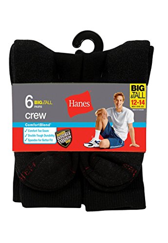 -. Binding : Apparel -. Brand : Hanes -. ClothingSize : 12-14 -. Color : White -. Department : mens -. Feature : Extra reinforced heel and toe / Stay up top / Spandex throughout for a superior fit / Comfort toe seam -- our smoothest toe seam -. Label : Hanes Men's Socks -. Manufacturer : Hanes Men's Socks -. Model : 910/6P -. NumberOfItems : 6 -. PackageQuantity : 1 -. ProductGroup : Apparel -. ProductTypeName : SOCKSHOSIERY -. Publisher : Hanes Men's Socks -. Size : 12-14 -. Studio : Hanes Men's Socks -. Title : Hanes Men's Big-Tall ComfortBlend Crew Socks (Pack of 6)