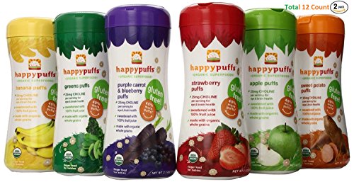 HAPPYBABY organic puffs are made with whole grains and the natural flavor of real fruit and vegetable juices--gives your baby variety and builds growing palettes. These are the very first melt-in-your-mouth organic finger foods for your baby. These puffs teach the baby tactility, self-feeding and might buy you some much needed silence. The puffs come in a green packaging that reduces HAPPYBABY's footprint and offers you 40% more in each container. They are all organic with 100% natural ingredients, no pesticides, no chemical fertilizers, no genetic modifications, and no preservatives. They contain half the sugar as compared to the other leading brands and are a good source of iron, vitamin D, calcium, and B vitamins. This is sold in a pack of six 2.1-ounce containers. Why buy individual cases to get every flavor, or only buy one at a time. Enjoy the convenience of a variety pack with every flavor! Current varieties are Apple, Banana, Greens, Strawberry, and Sweet Potato.Feature
