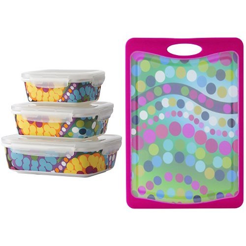 Includes a three piece storage container set and cutting board.