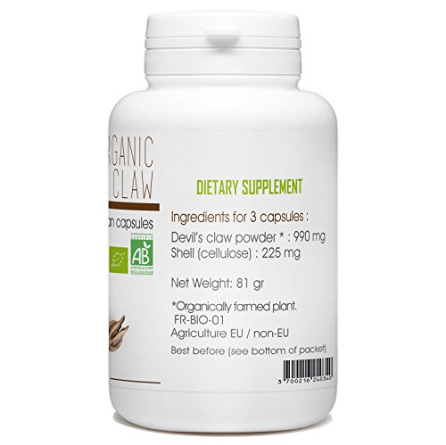 -. Feature : DEVIL'S CLAW - Harpagophytum Procumbens - Organic 200 Vegetarian Capsules - 330 mg / Organically farmed plant / 2 to 3 capsules a day with a large glass of water during meals and as part of balanced diet.