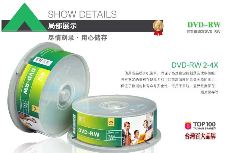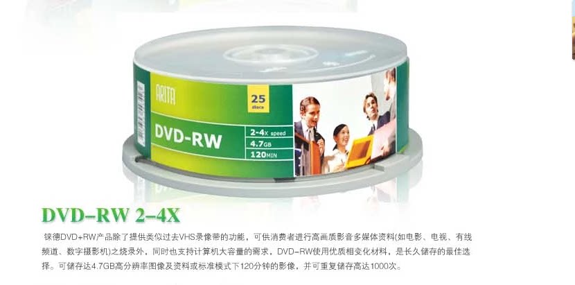 规格:4.7G,120分钟,4倍速。 ,支持DVD-RW格式。