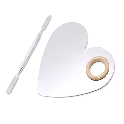 -. Feature : Stylish heart shape, fashion and lovely looking, great tool for mixing your foundations, lipstick, concealers, pigments etc. and create your own beauty and fashion / Size: heart palette: 119*98mm, 2-ended spatula: 116mm, and dia.22mm rubber-coated thumb hole for easy to hold / Material: Stainless steel material, easy to clean and wipe off / Suitable for professional or household use. / Including 1pc Palette and 1pc Spatula
