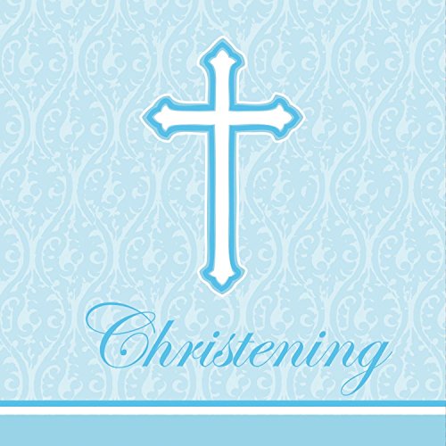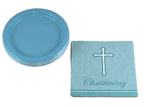 - Includes 24 solid blue dessert/appetizer plates and 18 luncheon napkins with cross on blue patterned background