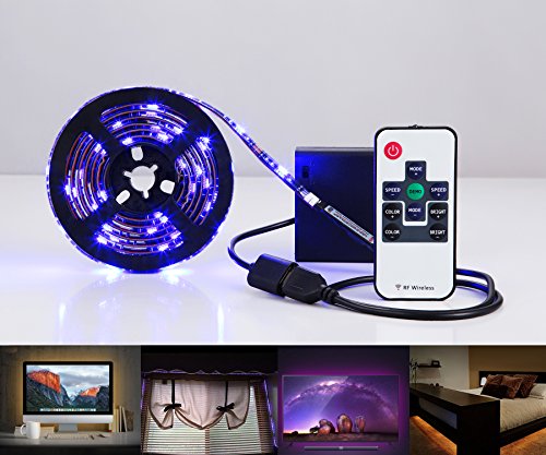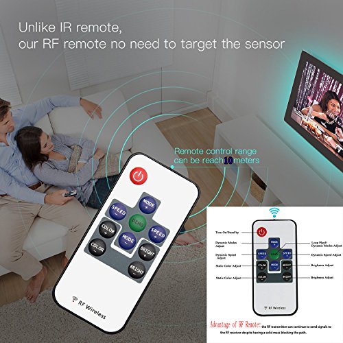 - RF WIRELESS REMOTE CONTROL: You can use RF wireless remote to control backlight strip freely within 10 meter distance & 360°no dead angle. Create fantasy backlight effect more freely! 20 kinds of stable colors, 18 kinds of color changeable mode, 6 adjustable dimming function and 6 different speeds. No need aim RF remote to the receiver, even through the walls & doors and no conflict with TV's remote control.