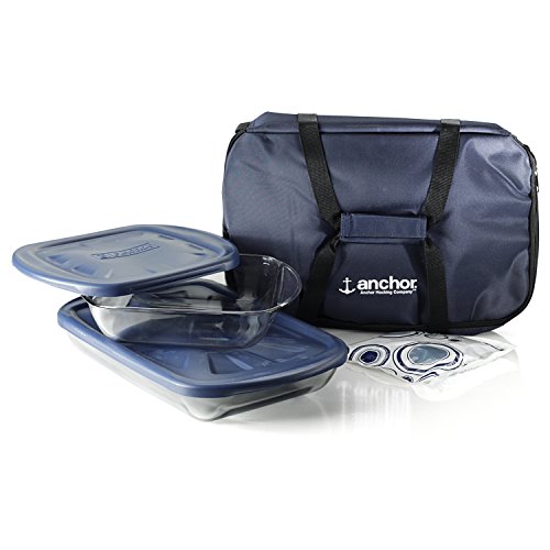Anchor Hocking 6-Piece Essentials Bake-N-Take Set with Blue Plastic Lid and Blue Tote