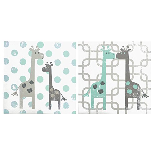 -. Feature : Includes a set of two adorable art pieces made of canvas stretched over a wooden frame; each measures 12 inches by 12 inches / Features adorable giraffe friends against mint polka dot and grey geometric backgrounds / Also features a unique distressed look, simulating marks of age and wear, lending an interesting artistic feel to the pieces / Saw tooth wall hangers are attached for easy hanging / Coordinates with the Uptown Giraffe Crib Bedding Collection by Peanut Shell