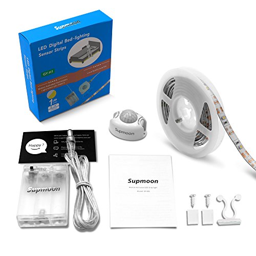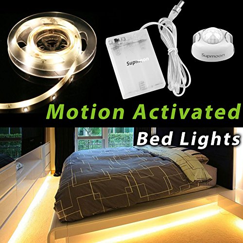 Motion Activated Bed Light, Supmoon Battery/ USB Powered LED Strip Motion Sensor Night Light Bedside Lamp with Automatic Off 3000K( Warm White)