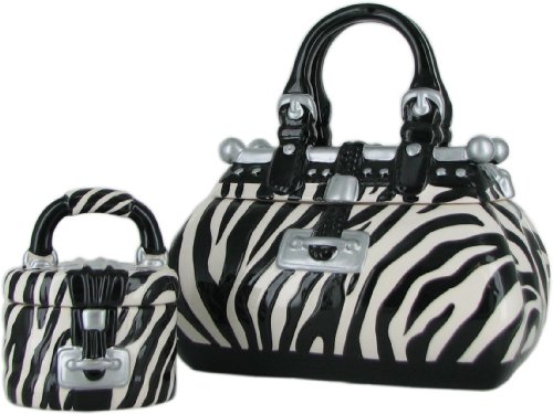 Charm and style exude from this chic handbag jar and its petite partner. This purse is not just for cookies; display the jars on your dresser or desk. Makes the perfect gift for your favorite fashionista Set includes one large purse cookie jar and one small purse treat jar. Full size jar measures approx. 9 1/4"L x 6 1/4"W x 8"H Treatsize jar measures approx. 3 3/4"L x 3 1/4"W x 4"H.Designerinspired Made of high quality ceramic Fully glazed and handpainted with meticulous attention to detail Not recommended for dishwasher and microwave