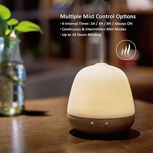MULTIPLE MIST CONTROL OPTIONS: Mia essential oil diffuser is designed with 4-INTERVAL TIMERS: 1hr, 3hrs, 8hrs, and Always ON. The 180ml water tank allows you to enjoy fragrance without an open flame in 2 MIST MODES: Continuous Mode provides 9 hours of intense aromatherapy, Intermittent Mode provides lasting for 18 hours with a milder scent. SMART AUTO SHUT OFF technology ensures maximum safety at all times when the water runs dry.