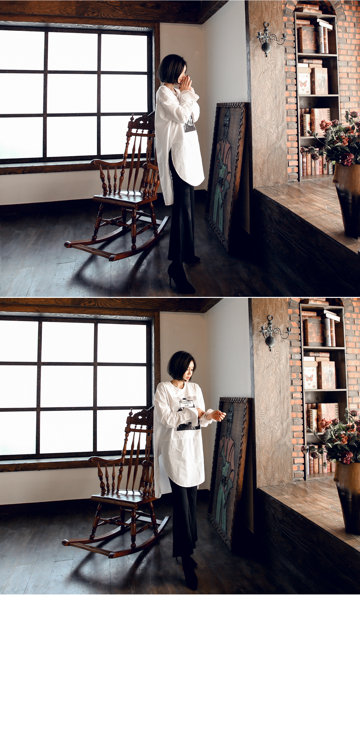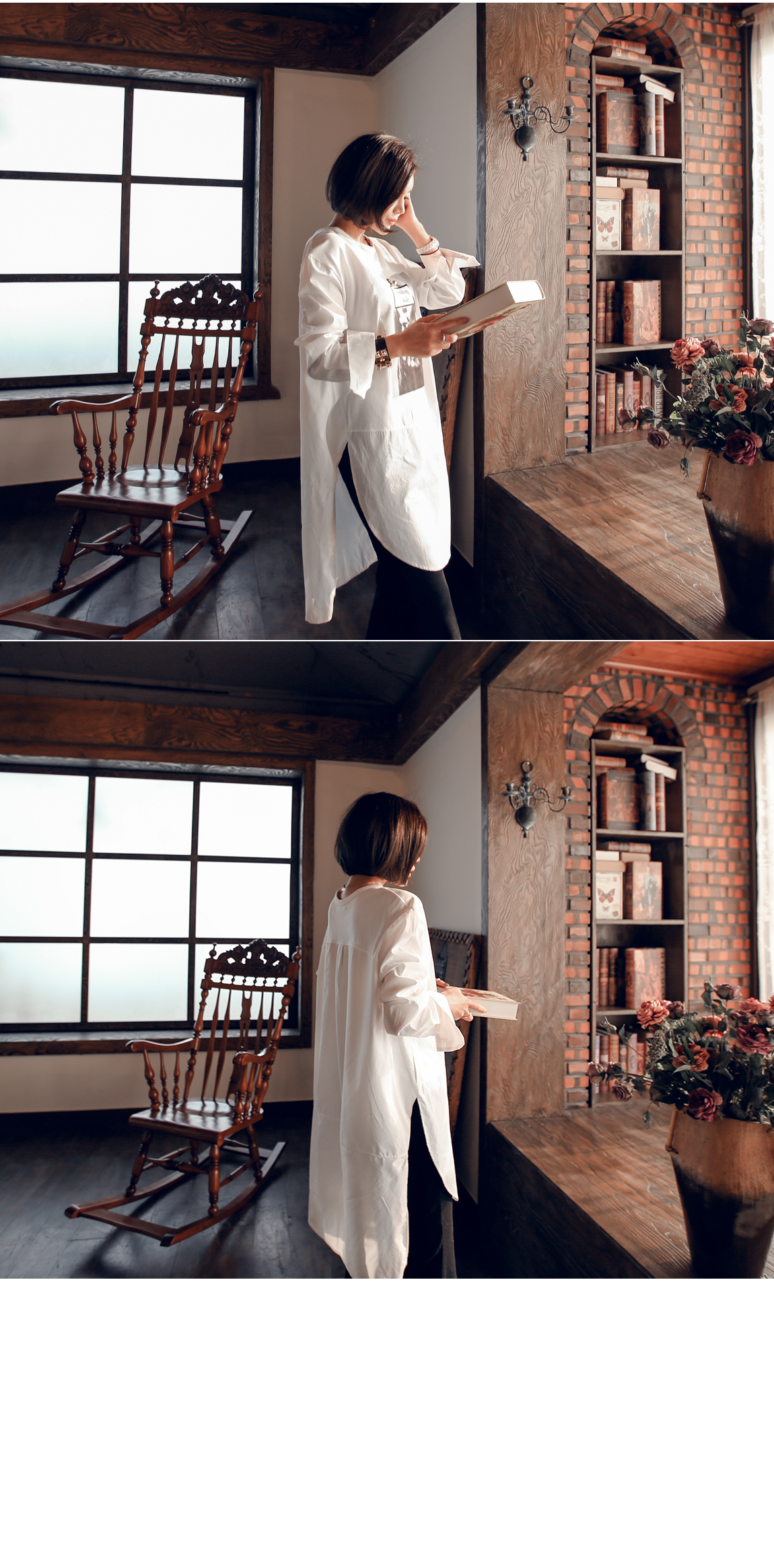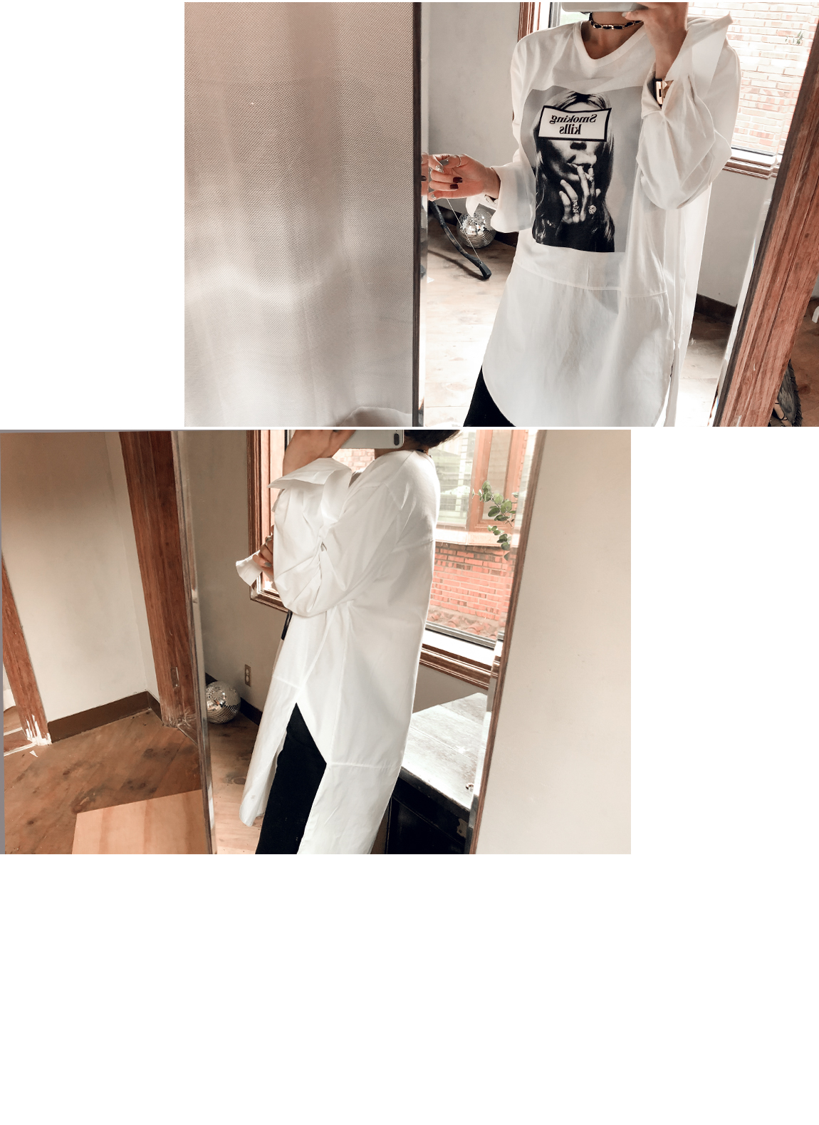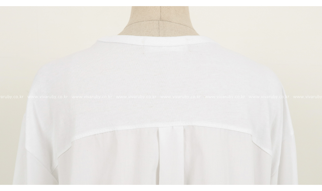 소매와 백라인, 밑단에 셔츠 소재감 배색으로