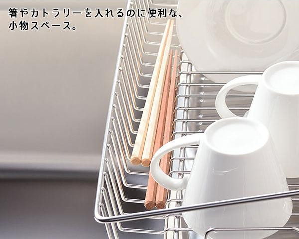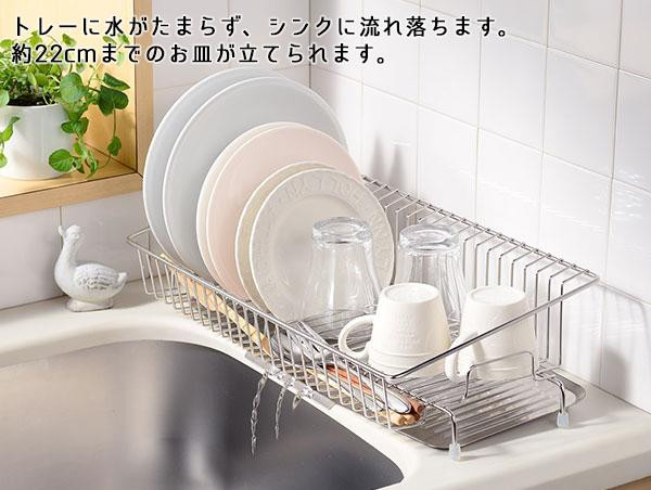 | シンクの横のせまいスペースに置きやすいスリムタイプの水切りカゴ。ワイヤーの間隔をせまくしているので、コップなどの細いものも安定して置けます。トレーの縁は巻き込みがないので、汚れがたまらず清潔です。脚はシリコンキャップ付きですべりにくく、キッチンを傷つけません。 |