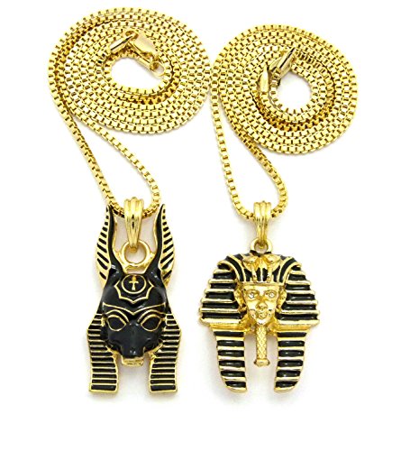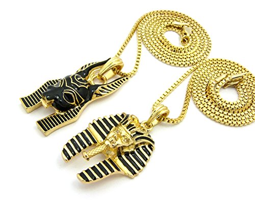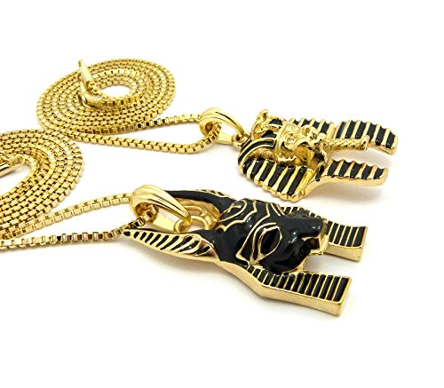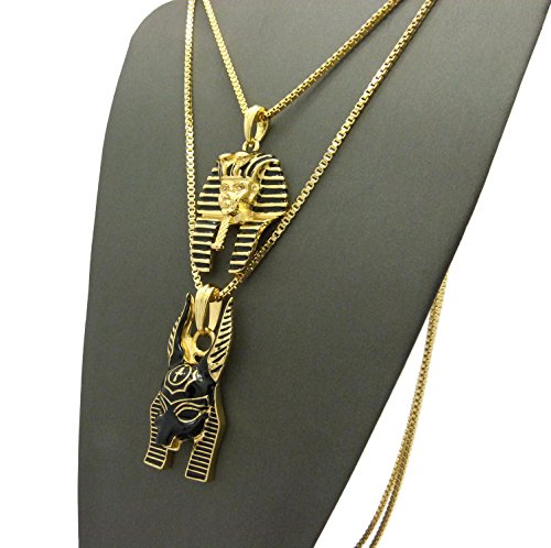 -. Feature : Egyptian King Pharaoh, Anubis Pendant 18",20",24",27",30" Box Chain 2 Necklace Set in Gold Tone / Pharaoh: 1.15" x 1.85", Anubis: 0.85" x 2.0" / Chain: 2mm 18", 20", 24", 27", 30" Box Chain / Fashion Costume Jewelry / Imitation Gold Color Plated