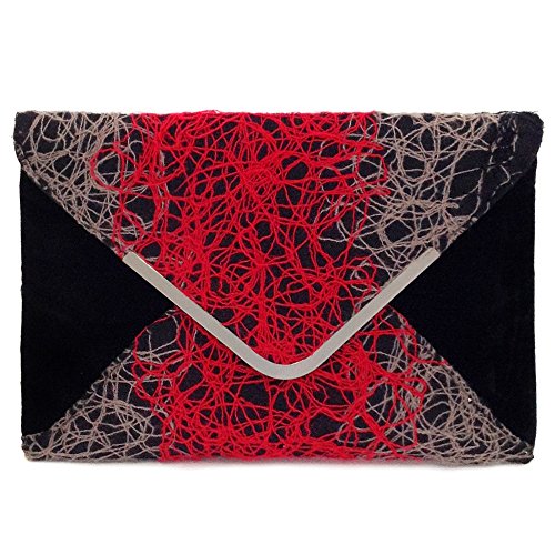 -. Brand : JNB -. Department : womens -. Feature : Comes with 21" drop crossbody chain / Black twill fabric lining / Inside features zippered pocket / Magnetic Snap Closure / Gun Metal color Hardware -. ProductGroup : Shoes -. ProductTypeName : HANDBAG -. Title : Ombre color Mixed Fabric Bohemian Envelope Clutch, Red