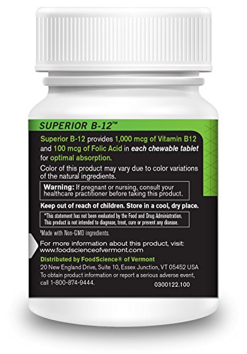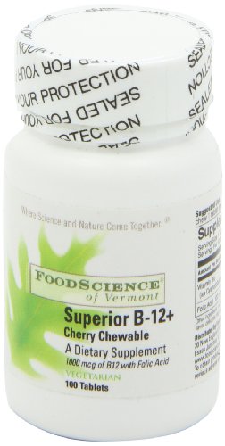 FoodScience of Vermont's Superior B-12 formula is a synergistic combination of vitamin B12 and folic acid. B vitamins are important to proper circulatory function, for maintaining blood pressure within normal ranges and preserving proper cholesterol and homocysteine levels. Food Science's chewable superior B12 provides 1,000 mcg of vitamin B12 and 100 mcg of folic acid in each tablet for optimal absorption.