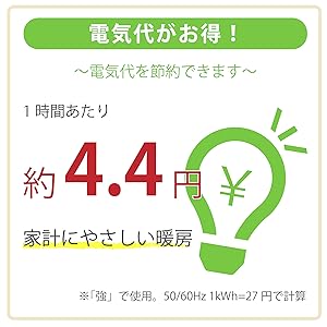 電気代(1時間あたり) :中 約3.1円、強 約4.4円 (1kWh=27円で計算)