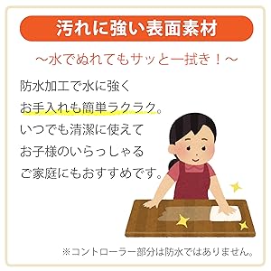 また、防水加工を施してあるので、万が一水をこぼしてしまってもさっとふき取れます。それに加えて、汚れにも強いので、お掃除が簡単にできます。