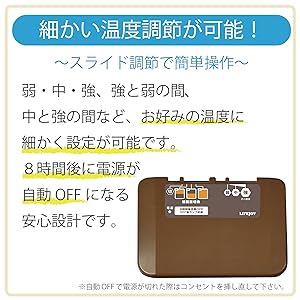 コントローラーのメモリには、弱・中・強がありますが、実は、「弱と中」「中と強」の間も細かく温度設定が可能です。お好みで細かく温度を調節できます。