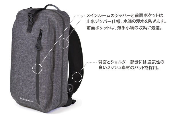 ●アオスタ インターセプターIIは、生活防水仕様のカメラバッグです。防水性に優れたTPU素材を採用し、メインルームやジッパーポケットには水滴が入りにくいよう配慮しています。