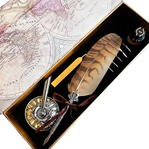 -. Feature : ★ CALLIGRAPHY PEN SET: Elegant in appearance and comes with 5 extra calligraphy nibs, 1 owl feather pen, 1 bottle 21cc ink, 1 sealing wax and 1 penstand. Perfect to meet the different need in your calligraphy English writing. / ★100%HAND CRAFTED: All of our Antique Quill Pens are hand crafted, six different nibs, can be used to write different size words. / ★PERFECT GIFT: Excellent packaging, highest quality materials used, and exquisite design, this feather quill set is an extremely popular luxury gift item meaning you'll be loved by friends and family! / ★EXCELLENT WORK: High quality bottled inks to ensure that Quill Dip Pen set is easy to use and write smoothly. / ★Can be used to study and practice, to sign the document, to sign the agreement, ect.