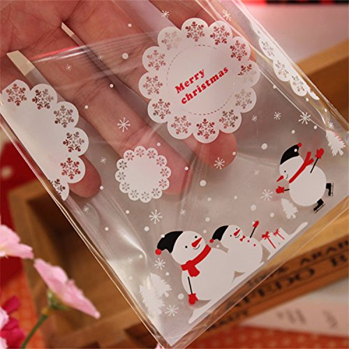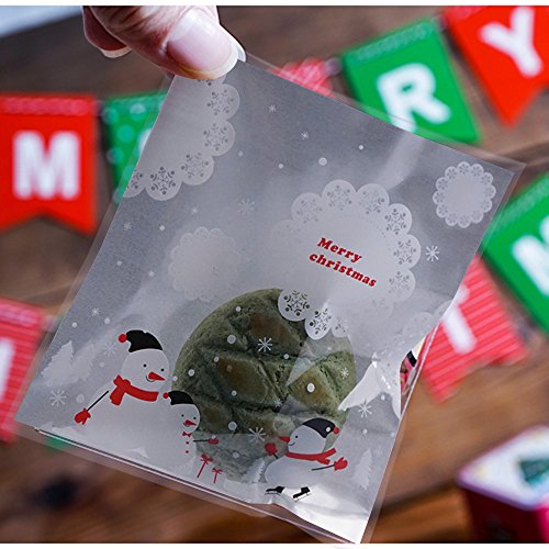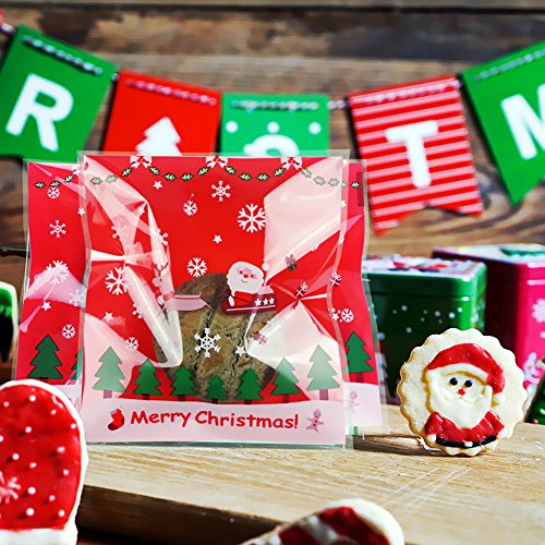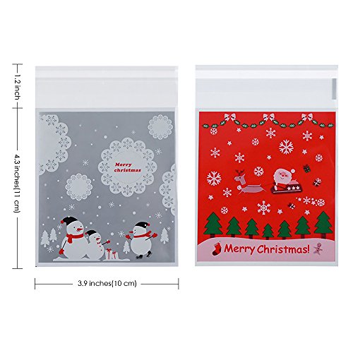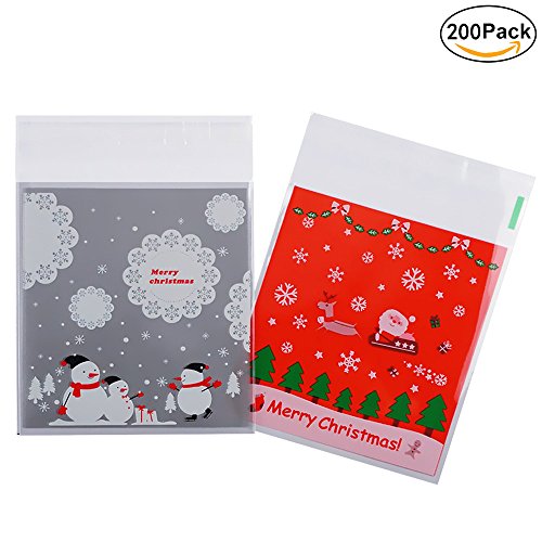 - Christmas Plastic Candy Bags: Cute cookie packaging bags includes 200 self-adhesive cellophane bags, 2 different patterns of Santa Claus bag and snowflake bags.