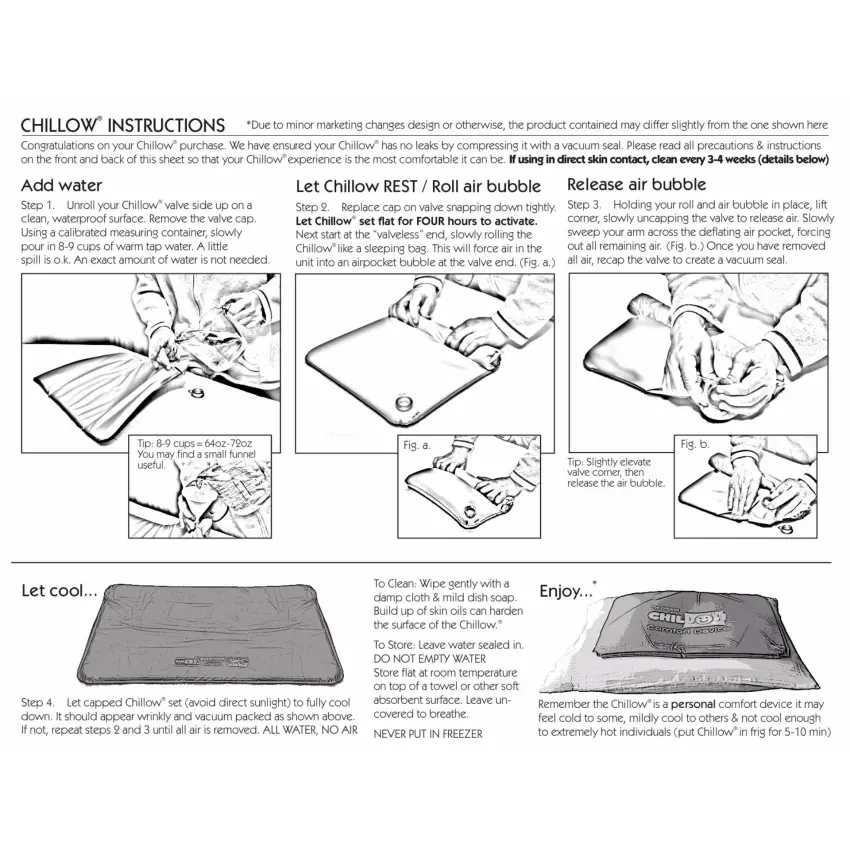 The Chillow cooling pad continuously circulates water to absorb and release body heat. Once activated the Chillow cooling pad will stay cooler that your body temperature, providing cooling, soothing comfort. No batteries or electricity required. Chillow is hypoalergentic, non-toxic and latex free.