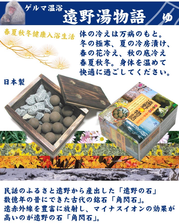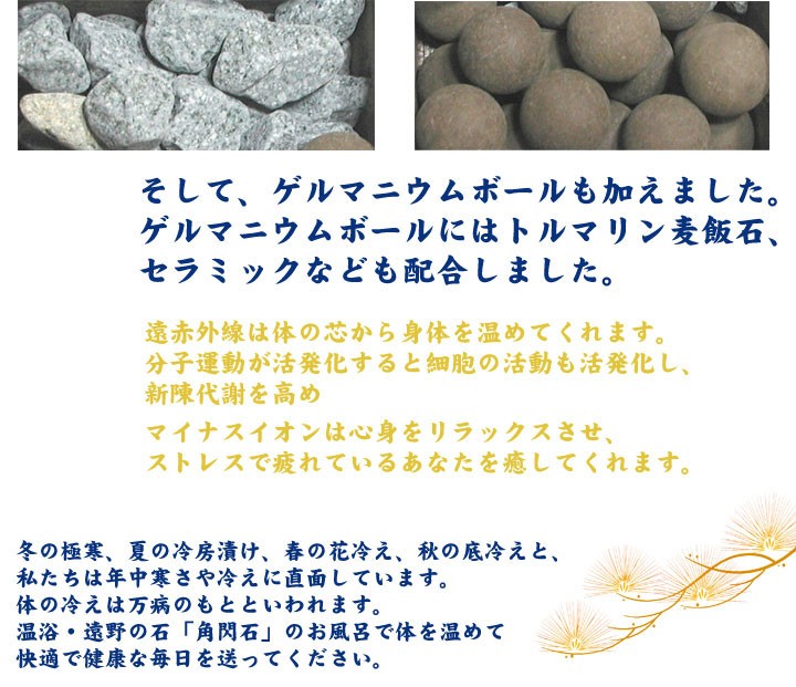説明民話のふるさと遠野から産出した「遠野の石」数億年の昔にできた古代の銘石「角閃石」、ゲルマニウムボールも加え、家庭で毎日温泉気分♪遠赤外線は体の芯から身体を温めてくれます。冬の極寒、夏の冷房漬け、春の花冷え、秋の底冷え、のお風呂で体を温めて快適で健康な毎日を送ってください。