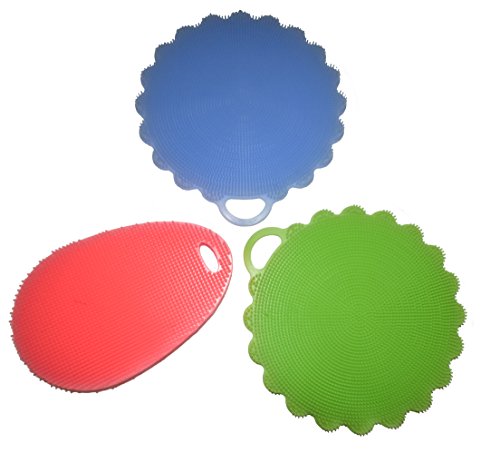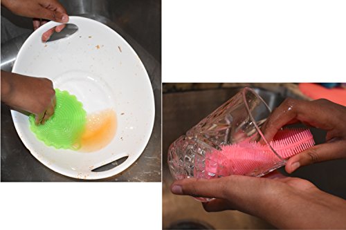 Silicone Dish Washing Brush / Scrubber - Food Grade, Non-Stick, Antibacterial, Heat Resistant , easy to clean and multi functional (Green and Light blue flower and Pink oval)