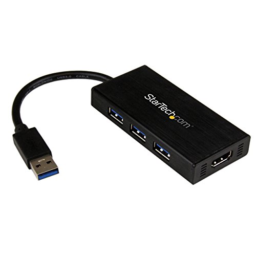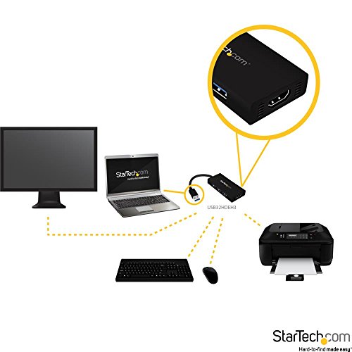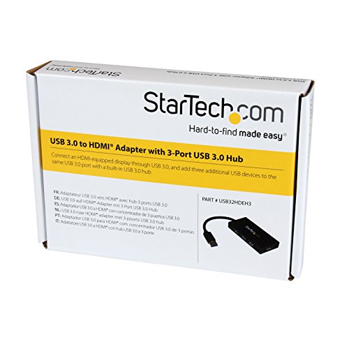 Connect an HDMI-equipped display through USB 3.0, and add three additional USB devices to the same USB 3.0 port with a built-in USB 3.0 hub - The USB32HDEH3 USB 3.0 to HDMI Adapter turns a USB 3.0 port into an HDMI output port with 1920x1200/1080p video support. The adapter features a built-in 3-port USB 3.0 hub, which enables you to connect three different USB devices, along with the display adapter, to the same USB 3.0 port - an ideal workaround for Ultrabook or laptop computers that have a limited number of USB ports available. Functioning as an external graphics card with audio support, this USB to HDMI adapter provides a convenient way to add multi-monitor capability to a USB 3.0-enabled desktop or laptop computer. Leveraging the high-bandwidth (5 Gbps) USB 3.0 interface, the adapter delivers smooth, high-definition content to your HDMI display / projector. The adapter can be used to mirror your primary desktop, showing the same image on each display, or to extend your desktop to double your workspace and increase your productivity. The USB32HDEH3 also features a built-in 3-port USB 3.0 hub, which lets you use the device as a mini dock for connecting peripherals such as a mouse, printer and keyboard along with your monitor. Then, it's as easy as connecting your laptop to the adapter to sync each device at your work station - a versatile solution for making your laptop portable when you want it to be, and powerful when you need it to be. Backed by a StarTech.com 2-year warranty and free lifetime technical support. Recommended System Requirements: CPU: Quad Core 2.4GHz or Higher (i5 recommended) RAM: 4GB or higher Available USB 3.0 portFeature