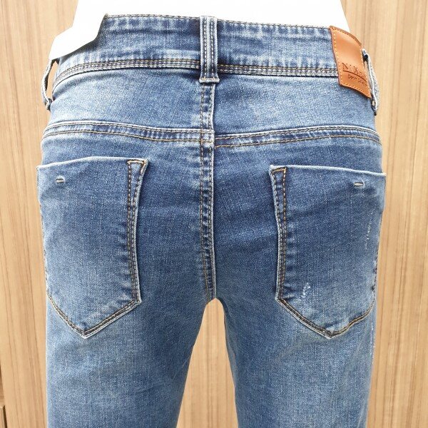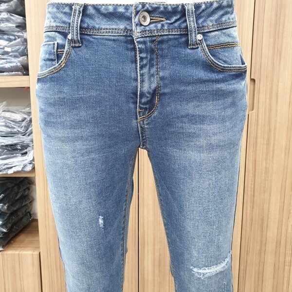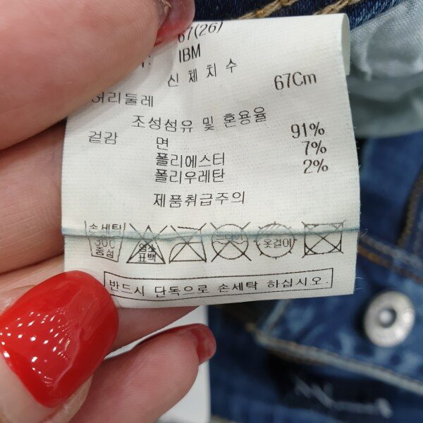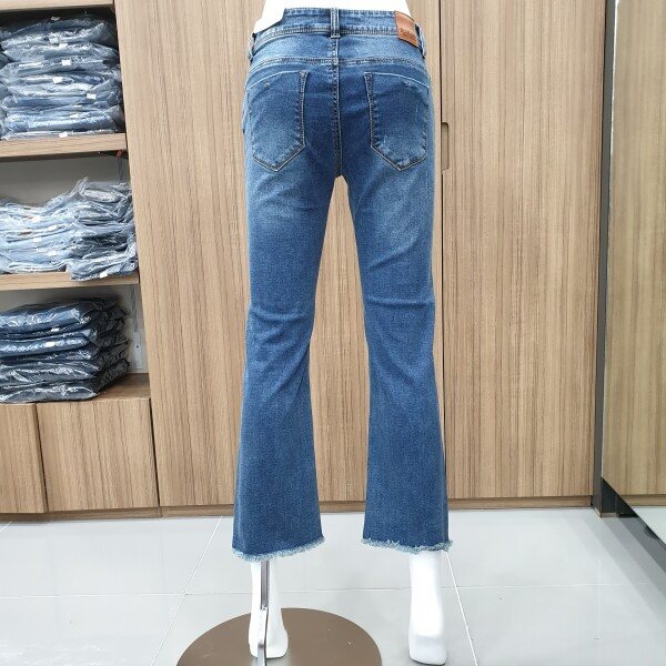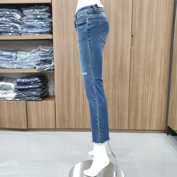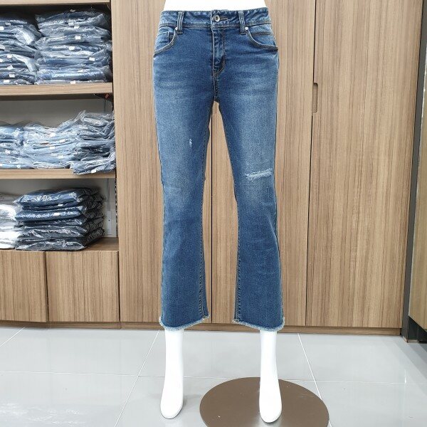 여자 M톤 구제 크롭 세미플레어 데님 입니다. 미디움 인디고 컬러. 섬세한 브러쉬와 무릎에 오픈구제 아래 재원단을 덧대어 안정감있는 착용감과 데님 특유의 워싱감을 선사한 데님 입니다. 마네킹 26size 착용