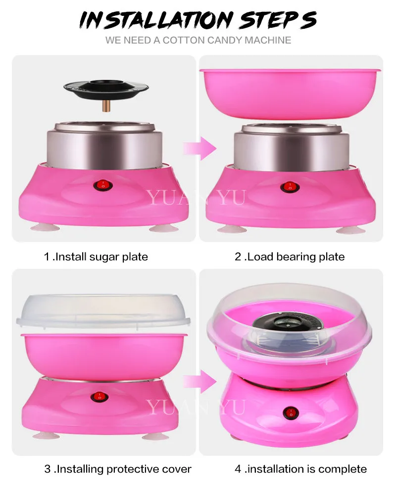*According to the theory of machine moving, just add sugar or granulated sugar into the machine,after heating, it will spout to cotton shape.it has stable and durable performance,low cost,risk-free, easy to operate