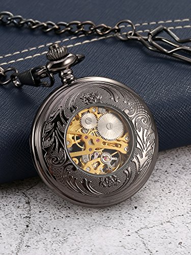 -. Feature : Size: case diameter: approx. 4.6 cm/ 1.8 inches; Case thickness (cover included): approx. 1.3 cm/ 0.5 inches; Chain length (hook included): approx. 37.5 cm/ 14.8 inches / Set time: pull the crown away from the watch base a little and turn the crown clockwise until reaching the exact time / No need other equipped batteries: this pocket watch features hand mechanical movement to wind up, it can work well even without a battery, and its power is from mechanical movement / Different match: the skeleton pocket watch comes with a gift box and microfiber cloth for easy daily cleaning, you can hang them on suit, vest, pants or other clothes / Use tips: when you get it, push the crown back into the watch base and wind up the watch clockwise 15 - 20 times, and the power will be full (over winding will ultimately break the sP.R.Ing)
