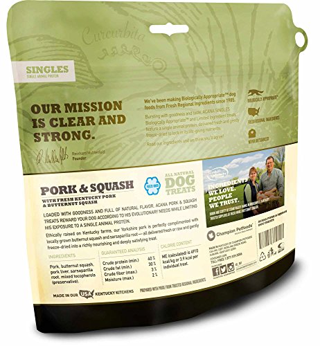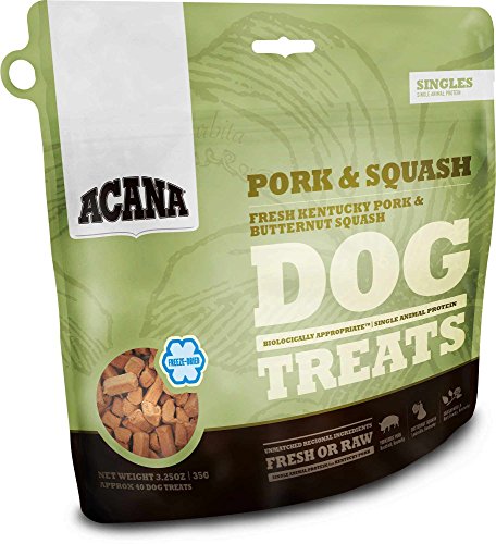 -. Binding : Misc. -. Brand : Orijen -. EAN : 0064992712907 -. Feature : Acana treats are gently freeze-dried to lock in their natural goodness and taste! / 4.3 kcal per treat, Approximately 105 treats per bag / Loaded with goodness and full of natural flavour, ACANA Pork & Squash Treats contains one single, easily digestible animal protein and rewards your dog according to his evolutionary needs -. Label : Deepwater Aquatics Distribution -. Manufacturer : Deepwater Aquatics Distribution -. Model : 064992712907 -. MPN : 064992712907 -. NumberOfItems : 1 -. PackageQuantity : 1 -. PartNumber : 064992712907 -. ProductGroup : Pet Products -. ProductTypeName : PET_SUPPLIES -. Publisher : Deepwater Aquatics Distribution -. Size : 3.25 oz -. Studio : Deepwater Aquatics Distribution -. Title : Orijen Acana Pork and Squash Freeze-Dried Dog Treats, 3.25 oz -. UPC : 064992712907