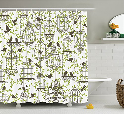 Ambesonne Vintage Decor Collection, Antique Lovely Birdcages on Ivy Leaf Love Couple Escape Freedom Modern Illustration , Polyester Fabric Bathroom Shower Curtain Set with Hooks, Navy Green