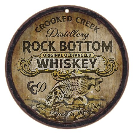 - Outdoors Inspired Round Wooden Sign Plaque - Crooked Creek Distillery Rock Bottom Original Oldfangled Whiskey