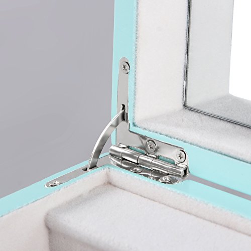 The Songmics wooden music jewelry box is exquisite and functional for girls' jewelry collection. Classical design with sweet cyan color adds romance and decorates your room. Bracelets, necklaces, rings, earrings and other precious keepsakes can be well organized in this wooden case. Lid needs only one hand to open, which enhances the convenience. Inner mirror is large and convenient to use. Also, we take pains on every single detail, including strengthened metal hinges and 4 bottom mats. This jewelry case, with great craftsmanship and superior artistry design, is no doubt a wonderful gift for girls, and will certainly bring beauty, joy and tidy to them.