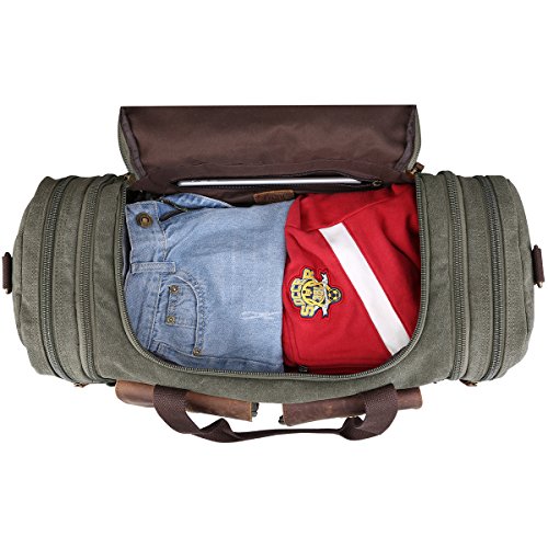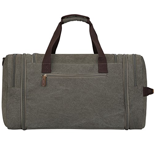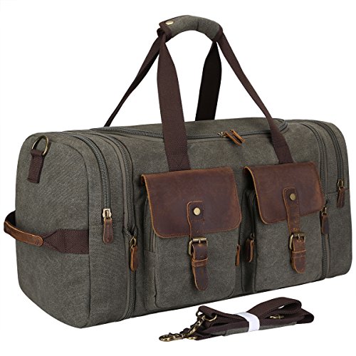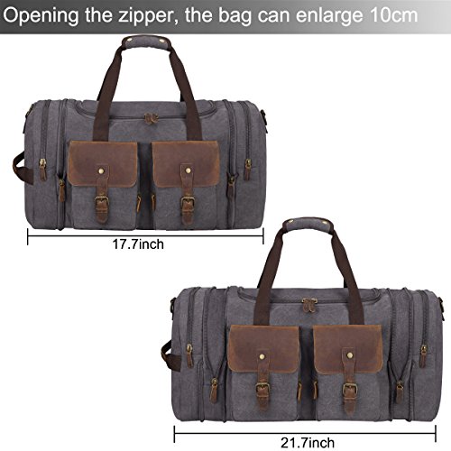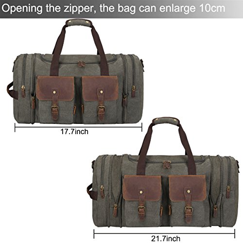 -. Feature : Soft durable canvas and top quality genuine crazy horse leather trim, stitching handcraft / Overized Dimensions: 17.7*11.8*9.8 inches, Expansion Dimensions: 21.7*11.8*9.8 inches, Expansion zipper design, after opening the zipper, the length of the bag can enlarge 4inch. / Multiple Pocket Design, Dual side pockets are perfect size for Your iPad. Snap buckle handle closure. Plenty of small pockets inside and out for documents, chargers, etc. / Multi-functional travel duffel bag, can be used as a flight bag, travel tote bag. Large capacity / Vintage fashion casual life style, General use for Female, Male. A perfect gift idea. One year warranty