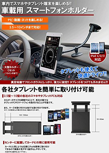 -. Feature : ■3.5~5.5型・9~10型の各社のスマホやタブレットPCも対応 ホルダーのサイズを調整することで、各社の様々なタブレットPCやスマートフォンを取付けることが可能です。 また、ケースを取り付けたままでも取り付けできます。 ※ケースの形状により取り付けれない場合がございます。 / ■センターに配置してカーナビの用に使用可能 カーナビと同じような位置にiPadを簡単に取り付けできるので、画面が見やすく操作もしやすいです。 ※走行中に操作をしないで下さい。 / ■保存した動画の鑑賞などの子供用のモニターとしても大活躍! 子供が長時間の旅行やドライブでも飽きないように子供用のモニターとしても活躍します! タブレット対応なのでスマートフォンと違い、大きな画面で後部座席に座っているお子様でも見やすいです。 退屈だった乗車時間が楽しみな時間に変わります! / ■商品スペック 3.5~5.5インチ携帯 9~10インチタブレット (140~190mm調節可能) ipad1/2/3対応 各種スマホ・タブレット対応 / ■超強力吸盤でフロントガラスとダッシュボードの2点で強力に吸着・固定! ダブル吸盤方式 吸盤はワンタッチで固定できるレバー式の真空吸盤で簡単に取り付け可能! ホルダーの底面には大型で強力な吸着力のあるジェル素材の吸盤を採用! 吸盤のレバーをスライドさせると吸盤内が真空状態になり、しっかりと固定できます。 iPadなどの大きなタブレットを取り付けても外れること無く安心して使用ができます。