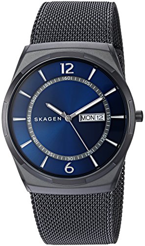 A grey inlay second ring stands out against the blue dial of this men's Melbye watch from Skagen.